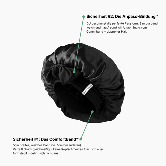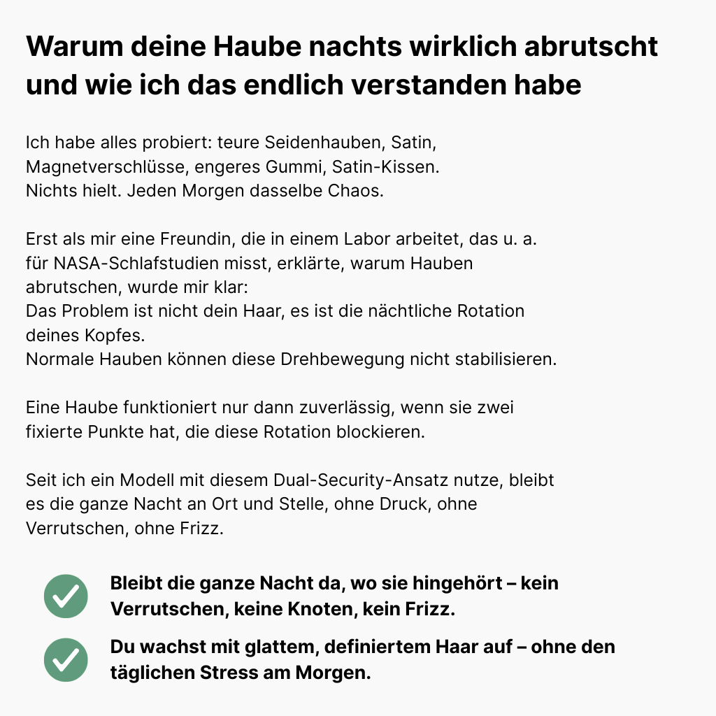 Ja! Das StayLock™ Dual-Security System sorgt dafür, dass deine Haube selbst bei viel Bewegung nicht verrutscht. Keine Druckstellen, kein Zwicken, kein Aufwachen ohne Haube – egal ob du ruhig schläfst oder dich viel drehst.